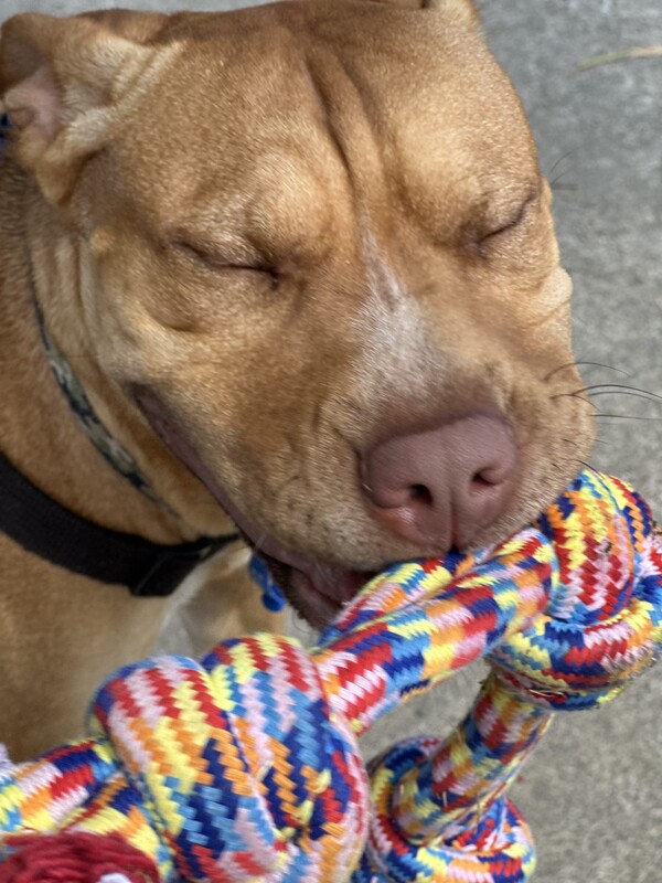 Pumba thrives in a quiet home where she can bond deeply with her people. We recommend setting up a "success station"-a cozy, designated area where she can retreat and feel secure. When introducing her to new friends, let her take the lead. Rolling treats toward her and allowing her to approach when she's ready will help build her confidence without pressure.