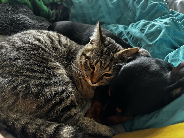 FRIENDS-Twirl may be able to live with gentle older children in a quiet household with supervision. We think she used to live with a dog who may have been her best friend.