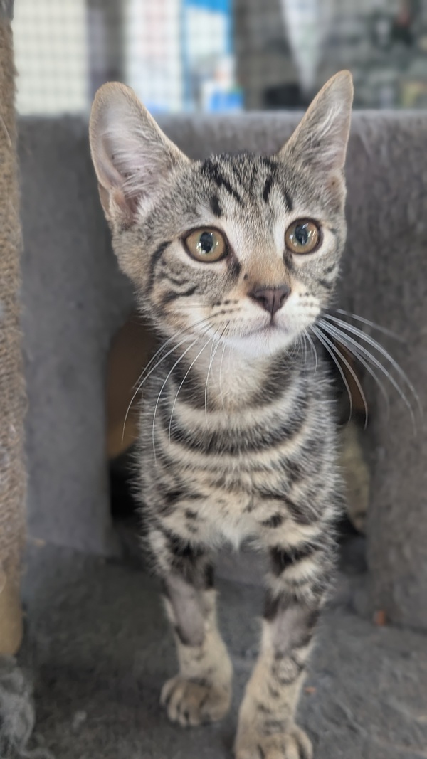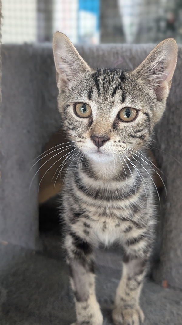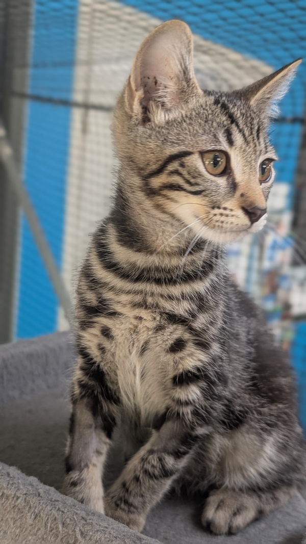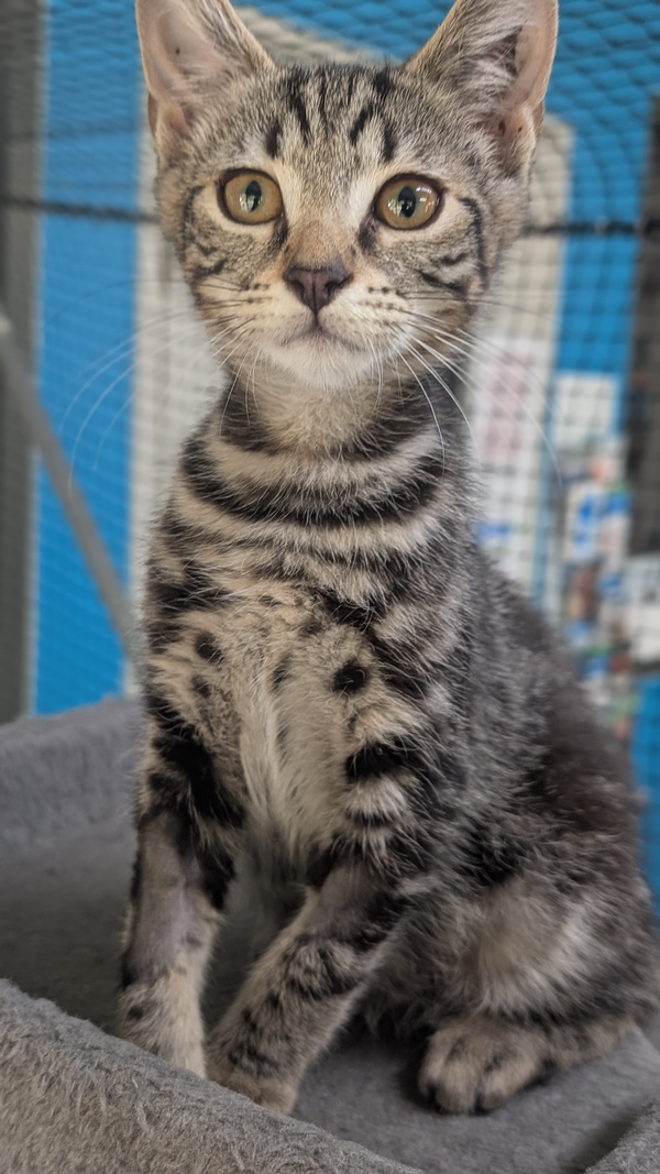 I am a friendly tabby with stunning markings. My name suits me since I am fearless and fight imaginary monsters in the form of stuffed toys, balls and my littermates. I am energetic and climb cat towers to show my prowess. Don't get me wrong, I am a lover too! I am a big purrer when picked up and will snuggle into you and lie with you on the couch. I would be a lovely companion. I would suit any home situation as I am very versatile but remember that my first few days in your home I may not show my true colours and I may need some adjustment time, like any animal would.