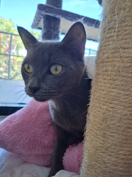 Meet Kahlua, a young cat with a heart full of love. Kahlua is the epitome of sweetness, always ready to cuddle up in a cozy lap. Despite her shy nature, once she warms up to you, her affectionate side shines through. She spends her days quietly observing her surroundings, dreaming of a forever home where she can feel safe and loved. Adopting Kahlua means bringing a gentle soul into your life, one who will offer endless affection and companionship.