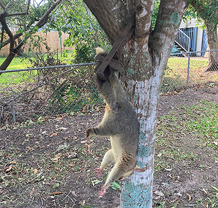 Hanging from a tree, this poor brushtail possum had his leg caught by a nasty steel jaw trap and was in immense pain and distress.